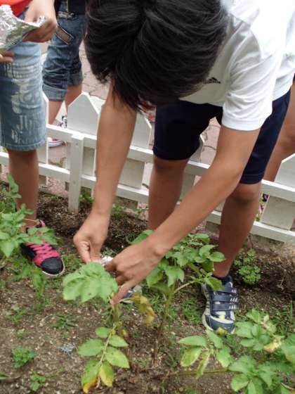 今日は,「植物の葉に日光があたると,葉にでんぷんができるのか」ということを調べるために,じゃがいもの葉にアルミニウムはくをかぶせて日光をあてないようにし,実験を開始しました。