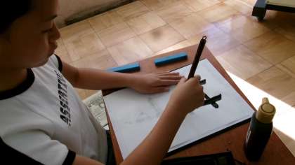 金曜日は「はす」というひらがなを書きました。ひらがなは漢字とちがって、丸みをもたせたり、つなげるように書いたり注意するポイントもかわります。特に「はす」では、たての結び、横の結びは筆を止めながら気をつけて練習していました。