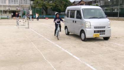 次はいよいよ実技走行です。道路に見立てた運動場を一人ずつゆっくりと走ります。道路に止まっている車両をよけるときにはどうしたらよいか、交差点での一旦停止は2回に分けて止まって左右の確認をすることなどを実際にしてみました。ヘルメットをしっかりとつけて走行しました。また、技能コースでは、杭をよけて走ったり、狭いコースをゆっくり走ったりしました。お世話になったPTAの方々、ありがとうございました。