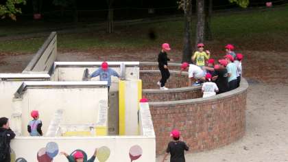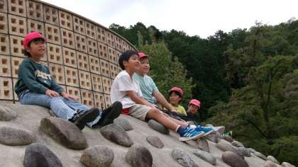 広い公園にいろんな遊具。子どもたちは歓声をあげながら思い思いの場所へ遊びに行きました。3年生に特に人気だったのが、「めいろでのおにごっこ」です。下級生も混じって楽しそうに遊んでいました。
