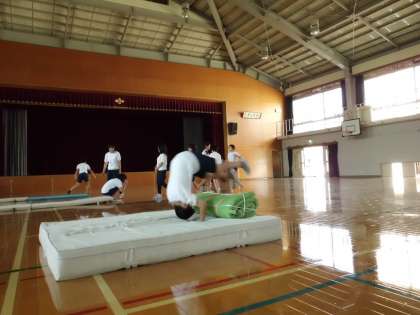 跳び前転や側方倒立回転,ロンダードなど,がんばればできそうな技を自分で選んで一生懸命練習しています。
