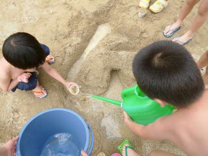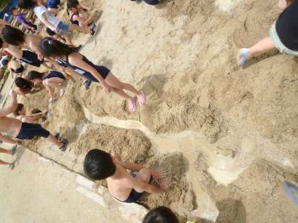 山を作ってトンネルをほったり,ほかのグループと協力して長〜い川を作ったりして,みんな夢中で活動していました。どろんこになってめいっぱい楽しみました。