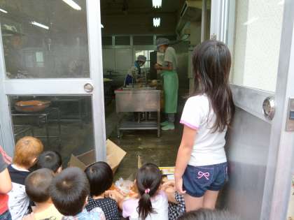 生活科の学習で,給食室を見学しました。今日の献立はハッシュドビーフ。大きなお鍋で炒めたり,野菜を一つずつ切ったりしているところを見せてもらいました。給食の後には,手作業と機械に分けてお皿を洗う様子も見せてもらいました。「見たい!見たい!」と興味津々で,のぞきこんでいました。調理員さんたちに感謝しながら給食を食べたいと思います。