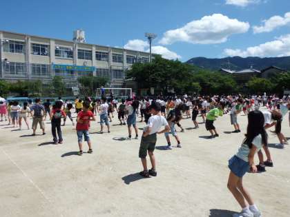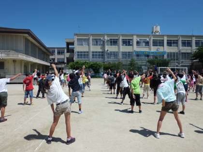 学校では中間休みにラジオ体操の練習をしました。