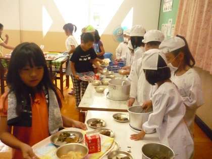 今日は,初めて『ランチルーム』で給食を食べました。 入ったとたん,子ども達の声・声・声 「レストランみたい。」「きれいなところ。」「すてきやな。」 さっそく,セルフサービスで並んで配膳です。「いただきます。」の声も弾みました。 栄養士の先生に,おはしで「魚の骨」をじゅずに出すことも教えて頂きました。