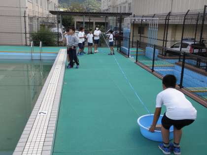 琵琶湖疏水の学習の1つとして,陸路と水路で同じ荷物を運ぶ時に,どれだけ重さが違うのかを学校のプールを使って実験してみました。