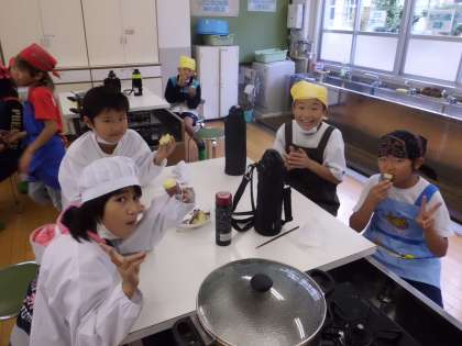 途中何度もふたを開け「いいにおい」と楽しみに待っており,できあがると「おいしい。」「あまい。」と言いながらおいしそうに食べていました。