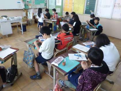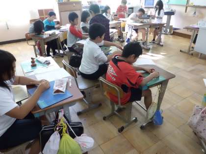 図工の時間に「ねん土のひもから」という題材で,ねん土を使って自分が考えたお城や家を作っています。