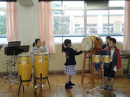 子どもたちは音色の違いや、かけ声のおもしろさに気づいたようです。