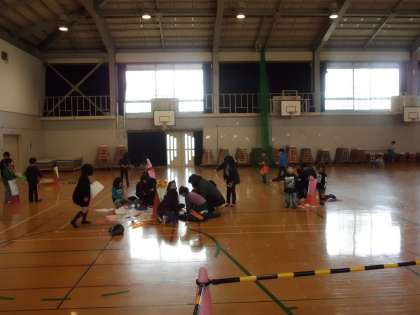 体育館では,めんこやあやとり,けんだま,百人一首などの昔遊びを楽しみました。