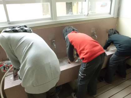 掃除時間に保健室前では、5年生が石けんを使ってキレイにしてくれています。