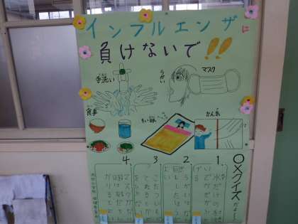 かぜ・インフルエンザに負けないようにどうしたらいいかを、皆で協力してかいたものを保健室前に貼っています。