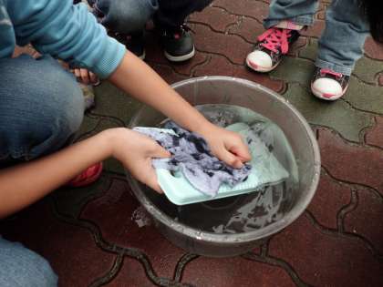 社会科で学習した,昔の道具を使ってタオルを洗いました。
