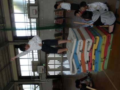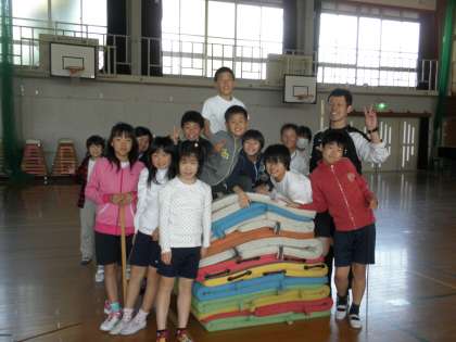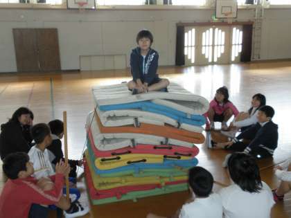 算数の体積の学習で1立方メートルを体育館のマットを使って実際に作ってみました。