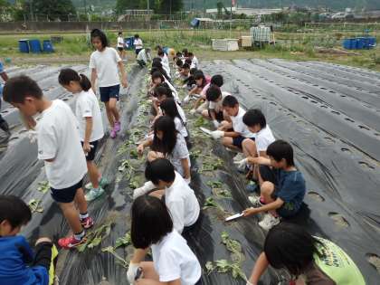 サツマイモの苗を植えました。苗を植える深さや向きについて教わった後で,苗植えに挑戦しました。「おいしいサツマイモが育ちますように…」一人一人が気持ちを込めて,丁寧に植えました。成長が楽しみですね。