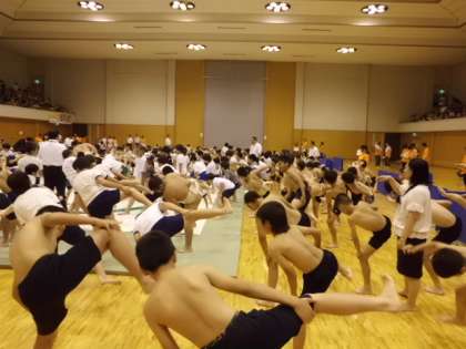 さあ,いよいよ相撲大会の始まりです。中学生の見本のすもうを見た後,準備運動をします。すもうの準備運動は,しこ踏みです。出場児童全員でしこ踏みをすると,体育館中に「ドーン。」という音が響き渡り,子どもたちは,みんなでするしこ踏みに気持ちを高ぶらせていました。