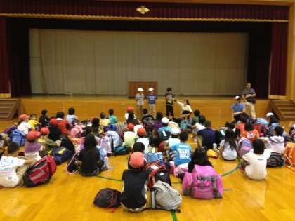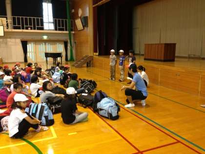 突然の雨に急きょ体育館での出発式となりました。全員元気に出発しました。三日間の野外活動いろいろな楽しい活動が目白押しです。