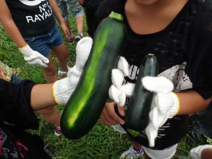上の写真にもあるように、すごく大きく成長しているズッキーニから、すこし小ぶりのズッキーニまで、大きさはさまざまでしたが、班ごとに協力して、ひとつひとつ丁寧に収穫することができていました。