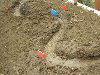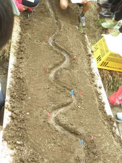 「雨が降ると,川の水が茶色くなるのはどうしてだろう?」という疑問点から,実際に小さい川を学校で作って水を流してみようという子どもの意見をもとに,実験をしました。