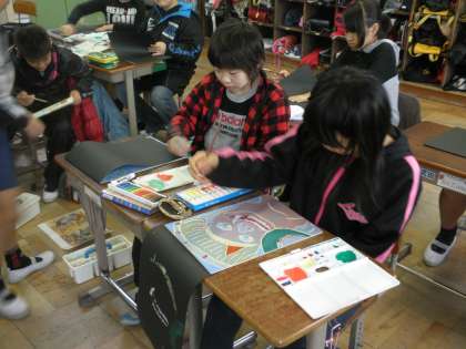 いよいよ色づけになると,1色1色ていねいに色を刷りこみ,宝箱を開くようにわくわくしながら紙を開いていました。