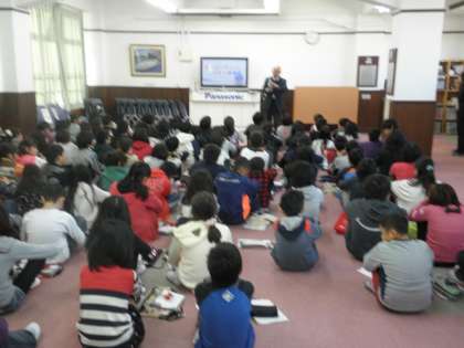 池田の5年生は,「京都新聞社」「井筒八つ橋」「京つけもの西利」「アメリカン航空」の代表としてあいさつをしました。