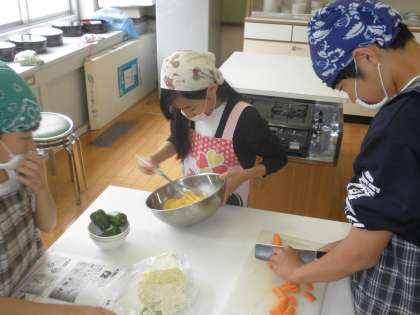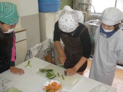 包丁づかいはまだまだ危ない子もいましたが,それぞれの野菜の切り方が学べ,いい経験になったようです。