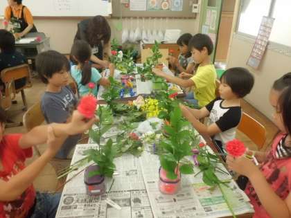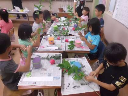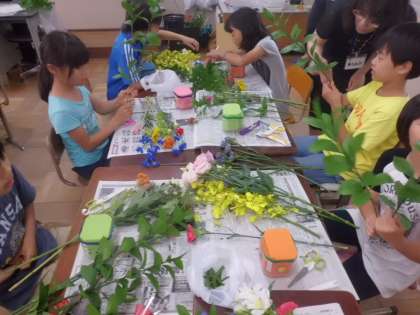 選んだ花を短く切ってスポンジにさしてアレンジメント!
