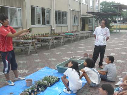 土の入れ方を教えてもらい,自分のもらった花をていねいに土の中に植えていました。