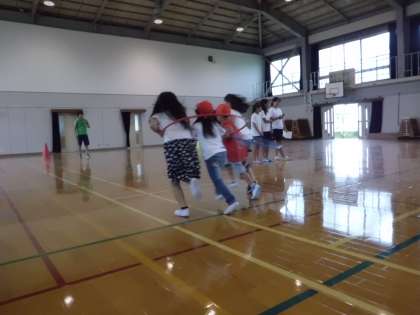 1年生とフラフープリレーをしました。