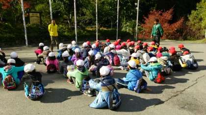 登山の注意をしっかり聞いて,準備体操もばっちりです。