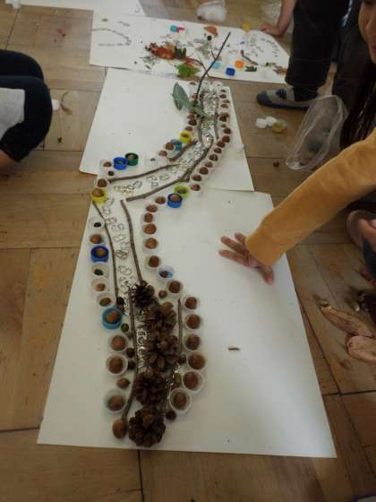 葉っぱや木の実,ペットボトルのふた,プルタブなどいろいろな材料を