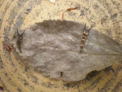 冷蔵庫で越冬させていた1〜1.5mmほどのオオムラサキの幼虫100匹ほどをエノキの木につけ寒冷紗(ネット)でおおいいをしました。