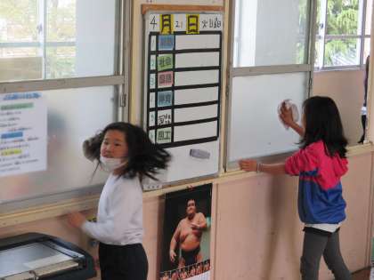 掃除の時間にそれぞれ協力し合いながら頑張っています。教室では,窓ふきやほうきをしっかりと隅々まで行い,教室前廊下も雑巾がけを行いました。中学年として下級生の見本となるようにしっかりと頑張っています。