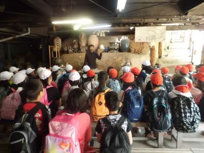 陶器のことについて,工房の登り窯の前で全体でお話しを聞きました。最近では登り窯を実際に使用することはなく(煙などのため),ガスや石油で焼くそうです。また,陶器と磁器の違いについても聞きました。