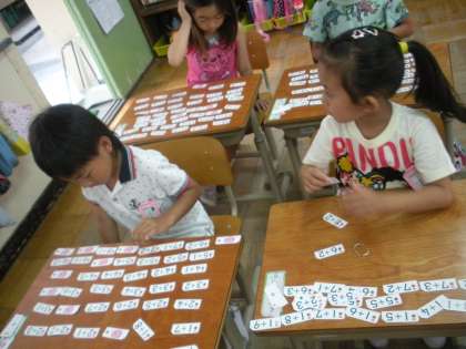 算数で計算カードを使い始めました。簡単なたしざんができるようになって、嬉しい様子の1年生です。