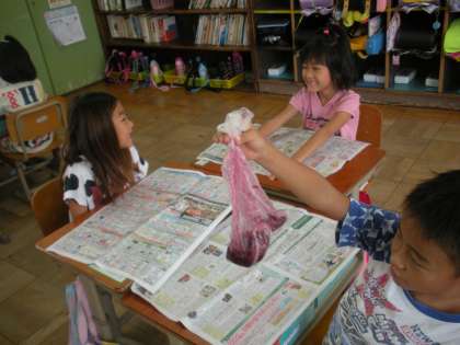 みんなの育てたあさがおのお花を使って、色水をつくりました。