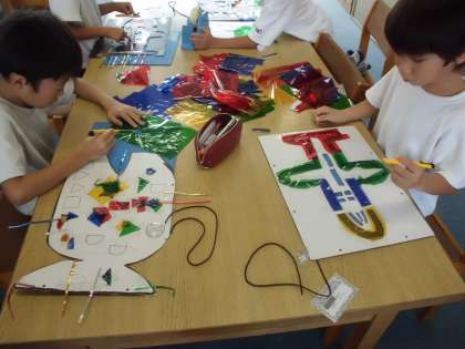 光のパワーでいろんな色に光る作品を思い浮かべてがんばっていました。