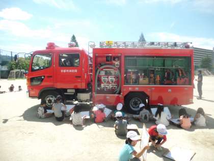 今日は消防車に乗って消防士さんたちが来てくれました。