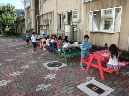 中庭の青空レストランで給食を食べました。