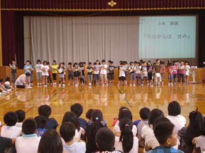 全校合唱では,音楽部の児童が前に出て,歌い方や姿勢などの見本となって頑張っていました。