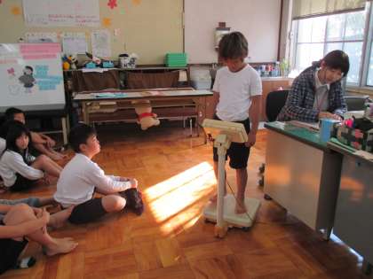 体重測定の前に,保健指導として服の着方についてお話をしました。