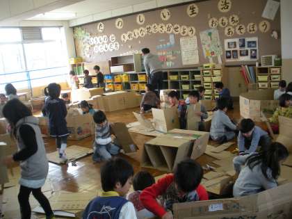 生活科の学習で、段ボールを切ったり貼ったりつなげたりしながらダイナミックに作業しています。