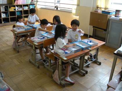 お隣の席のお友だちに何個か数図ブロックを見せて