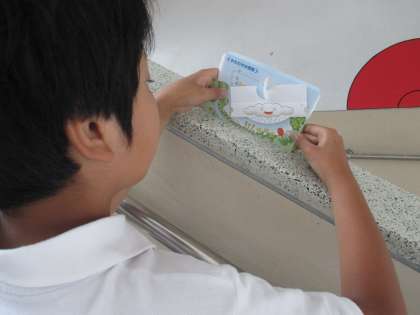 教室や校舎の中にあるものの角度を予想してから「かたむき分度器」を使ってはかります。