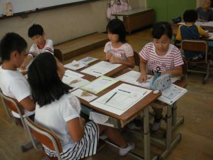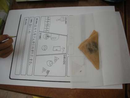 社会科で,「工場でつくられているもの」の学習をしているので,どんな手順でどのようにして八つ橋の商品が出来上がるのかを予想しました。