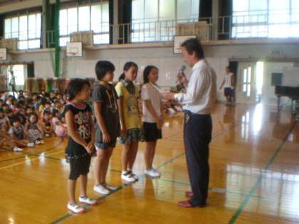 校長先生から賞状を受け取り,全校児童から大きな拍手をもらいました。