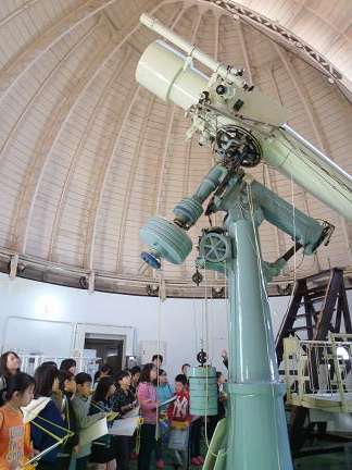 大きな望遠鏡を動かす仕組みは,87年前からロープを引っ張って手動でした。子どもたちが動かしてみました。太陽の光を調べるには,たくさんの大きな鏡が必要なこと,光のスペクトルも自分たちの目で確認できました。