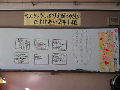 2年1組の人権目標は,「えがおと やさしい心で たすけあえば 友だちの心も ぽっかぽか」です。クラスのみんなで話し合って考えました。