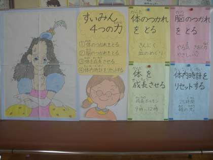 保健室では身体計測の前に、睡眠のはたらきについて学習しています。