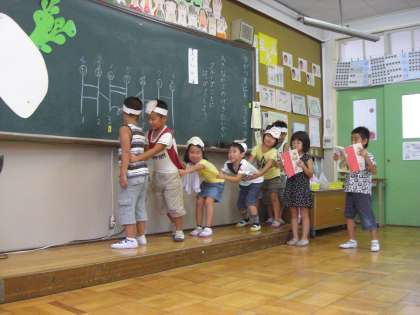 1・2組合同で音読劇の発表をしました。大きな声で「うんとこしょ どっこいしょ」とかぶを抜いたり,長い文を一生懸命読んだりする姿は,元気いっぱいでかわいらしかったです。初めての漢字の学習にも意欲的に取り組んでいます。